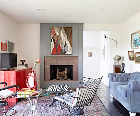 در اینجا از رنگ های مختلفی برای طراحی اتاق استفاده شده است .شومینه ای به رنگ قهوه ای با دیوارهای سفید و تلویزیون مشکی که روی یک کمد قرمز قرار داده شده است و مبلمان رنگی در اتاق نشیمن استفاده شده است.