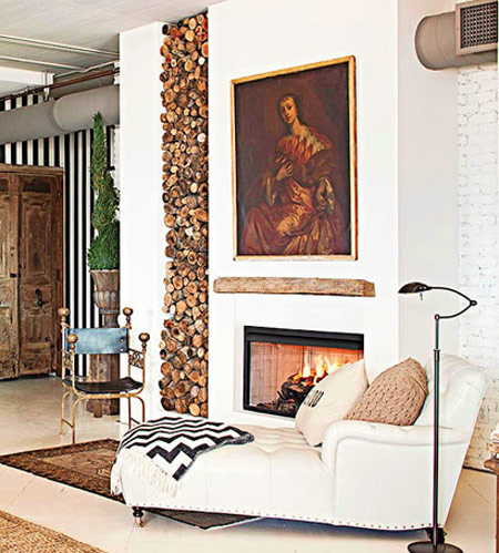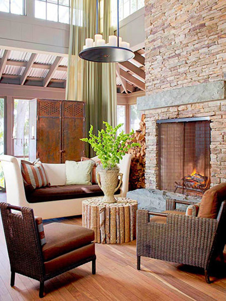 شومینه در اتاق پذیرایی از جنس سنگ هایی شبیه چوب و آجر :
