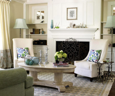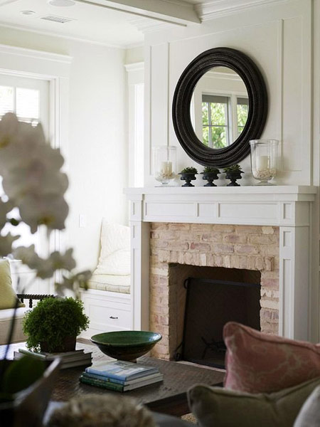 رنگ سفید شومینه و رنگ مشکی یک تلویزیون روی طاقچه و رنگ سبز دیوارها باهم جلوه ی زیبایی را به این نقطه از اتاق می دهد. آجرهای شومینه و طاقچه ی سفید متناسب با هم درآمده و دیوار های سبز رنگ در کنار هم به صورتی متعادل درآمده اند . قرارگرفتن یک تلویزیون روی شومینه بسیار خوشآیند بوده چرا که رنگ قاب آن با رنگ دیوارها یکی می باشد.