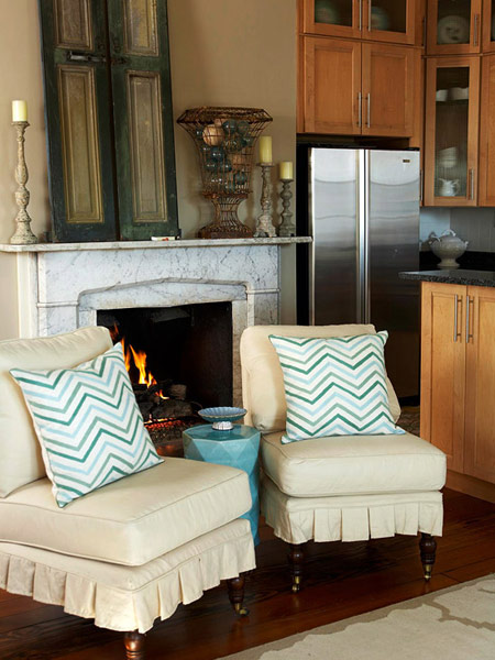 ترکیبی از کاشی های آجری شکل و مصالح چوبی برای اتاق پذیرایی مناسب می باشد .یک میز قهوه و یک قفسه ی کتاب در کنار آن پیشنهاد می شود.رنگ دیوارها همانند رنگ چوب می باشد تا با رنگ مصالح استفاده شده در ساخت شومینه هماهنگ باشد.